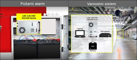 Napajalniki MEAN WELL LAD serije ustrezajo vsem standardom za varnostne in požarno-alarmne sisteme in so kot takšni primerna izbira za uporabo v alarmnih sistemih, sistemih za požarno varnost ter drugih sistemih kjer so potrebe po UPS funkcionalnosti.