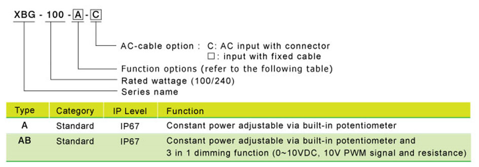 Trenutno so na voljo XBG napajalniki moči 100W, 160W in 240W, kateri lahko pokrijejo večino potreb po napajalnikih v svetilih za gospodarska poslopja in reflektorjih. S še vedno aktualnimi napajalniki HBG-60 in HBGC-300 je ponudba s krožnimi LED gonilniki zaokrožena in kot tako pokrije večino strankinih potreb. Če pa je potreben nadzor preko DALI je serija HBG še vedno ostaja vaša prva izbira. Serija XBG je rezultat dolgoletnih izkušenj inženirjev in v skladu z vsemi potrebnimi varnostnimi standardi. Poleg tega je vhod za izmenični tok zasnovan z vodotesnim konektorjem, kar omogoča tudi prilagajanje dolžine napajalnega kabla.